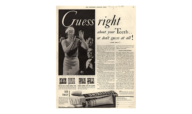 This ad promoting Dr. West's Toothpaste appeared in The Saturday Evening Post on May 6, 1933. (Image via Duke University-https://idn.duke.edu/ark:/87924/r4gb1z432).