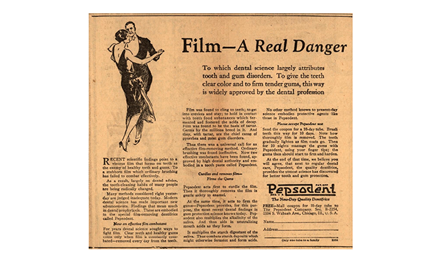 This Pepsodent ad appeared in a periodicals as early as 1916. The advert warns against film build up on teeth. (Image via Duke University-https://idn.duke.edu/ark:/87924/r4542jx4d).