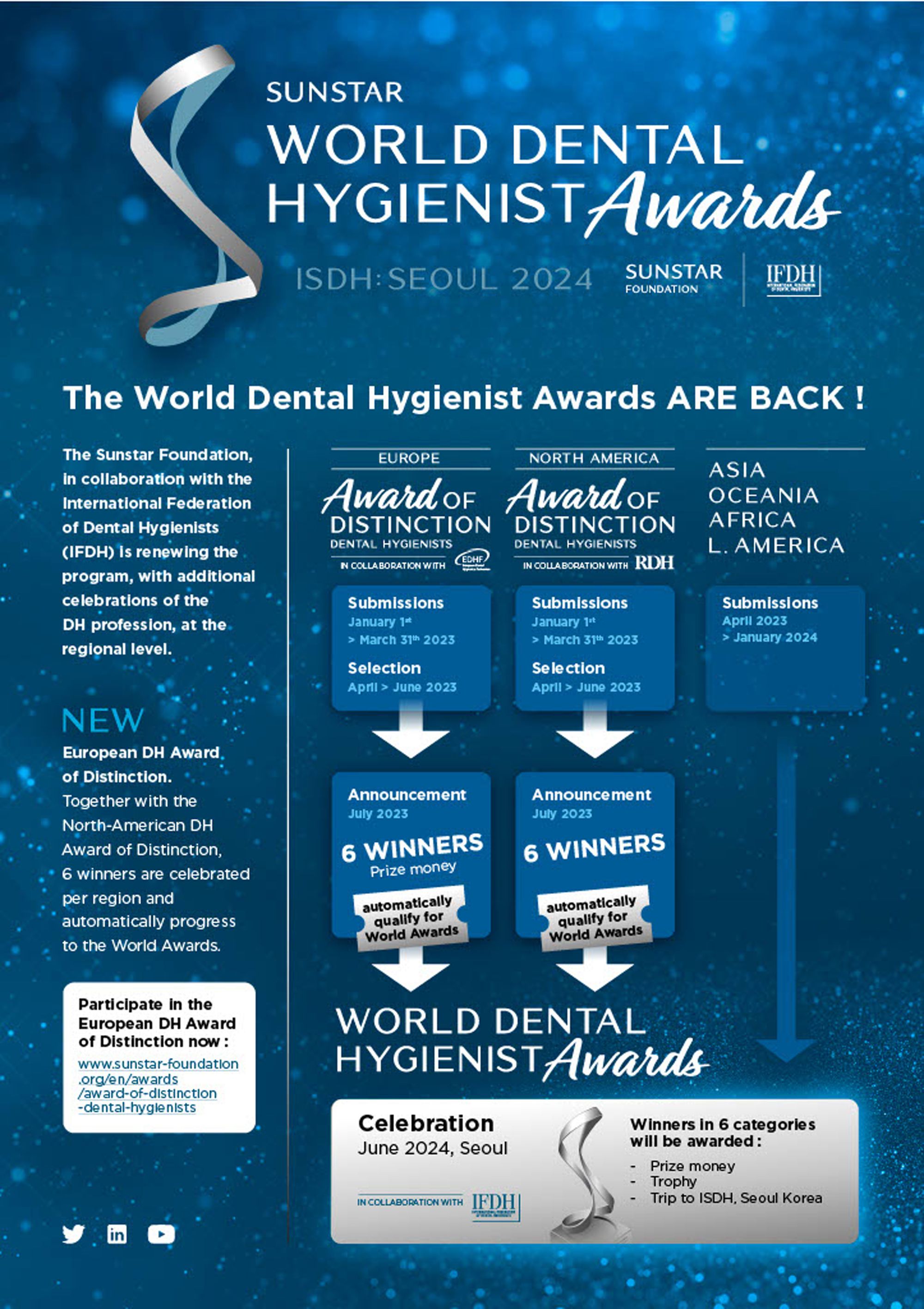 A regional Award of Distinction has been created in partnership with the European Dental Hygienist Federation to celebrate European dental hygienists. This will combine with a North America Award of Distinction to be a qualification round to the WDHA program. The regional awards and the WDHA are split into 6 categories including Public Health, Full Time Clinician, Academia, Entrepreneur, New RDH, and Research.