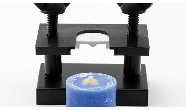 A lot of effort has gone into figuring out how to accurately test the strength of bonding agents between teeth and composite. To do this, we section human teeth and embed them in acrylic. Then we grind the surface with a disk to simulate fresh cut tooth structure. Once I had the specimens, I followed each manufacturer’s instruction in the application of their adhesive to either dentin or enamel. After the application of the adhesive and a 10-second cure with a VALO Grand curing light from Ultradent Products on the standard setting, I placed the specimen into a jig specifically designed to create a slow speed bur shank size of composite.