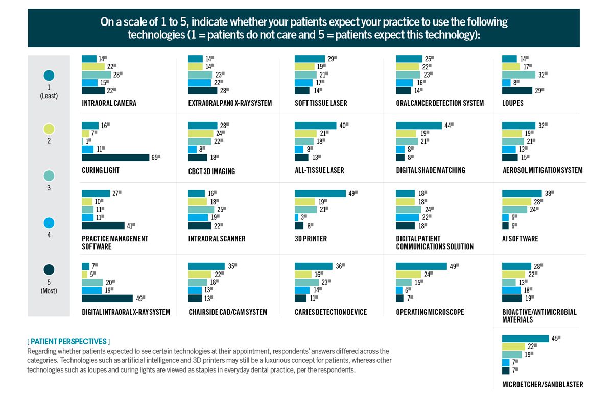 Regarding whether patients expected to see certain technologies at their appointment, respondents’ answers differed across the categories. Technologies such as artificial intelligence and 3D printers may still be a luxurious concept for patients, whereas other technologies such as loupes and curing lights are viewed as staples in everyday dental practice, per the respondents.