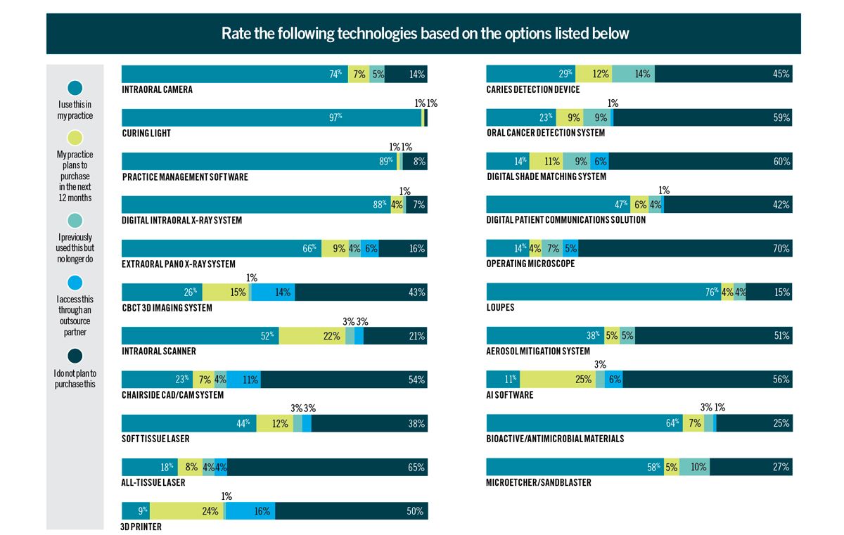 According to this year’s survey, dental professionals are still most confident in owning familiar technologies such as curing lights, practice management software, intraoral x-ray systems, and more. Emerging technologies such as artificial intelligence (AI) are still met with some resistance; however, plans may change, as 25% of respondents said they will purchase such technologies eventually. This is in stark contrast with 2022’s results, which indicated that only 9% of respondents would purchase AI software within the next year.