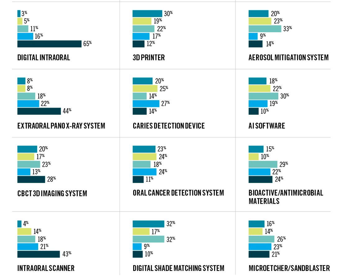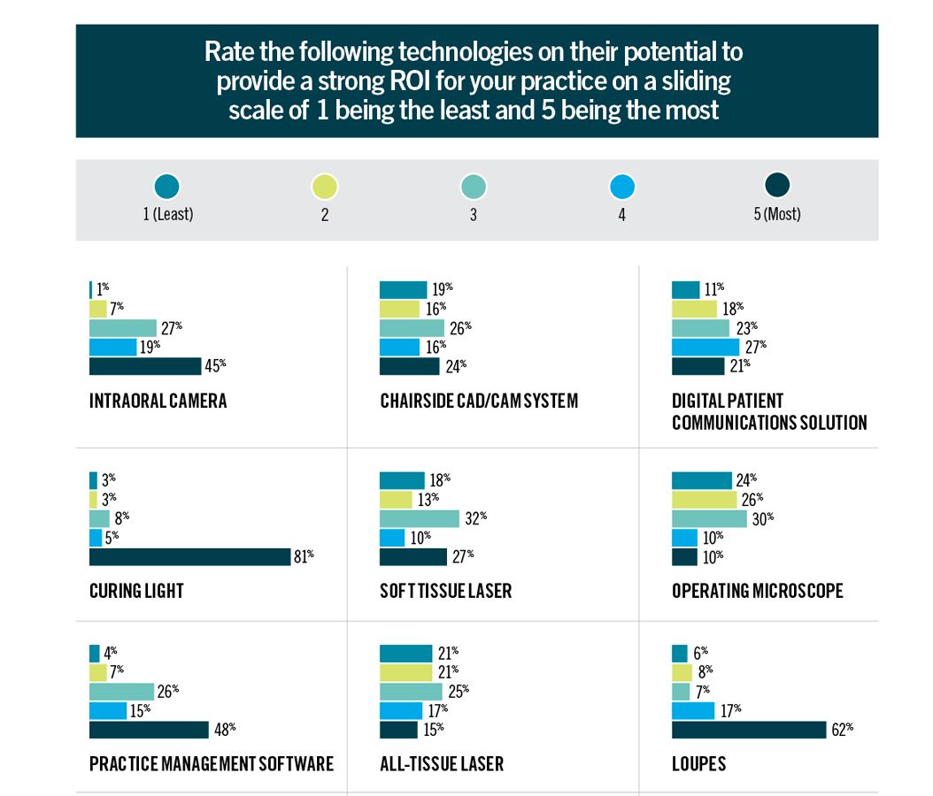 Considering a practice’s return on investment (ROI) is important to dental professionals, with 24% of respondents saying that ROI was a deciding factor for them. According to respondents, the technology with the smallest ROI was the same as that of 2022—a digital shade-matching system. Popular technologies in this category included curing lights and digital intraoral x-ray systems.