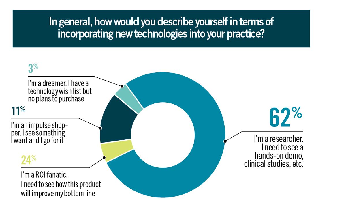 More than half the respondents said research is most important when considering a new technology for the dental practice. This may be comforting for patients, knowing that their dental professional did their homework to determine what best fits their dental practice. This is a bit of a bump up from 2022’s results, where 56% of respondents claimed research as being the most important factor.