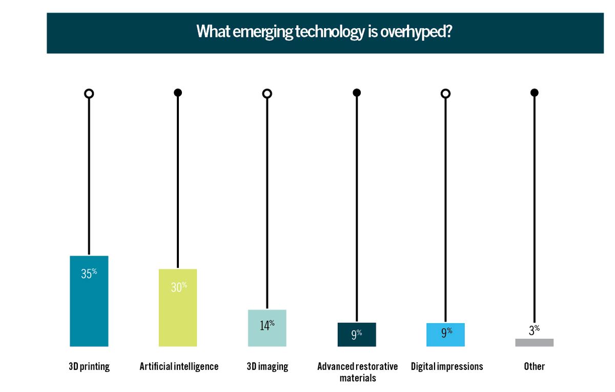 Respondents were split on what technologies were overhyped in the dental industry. Although 35% agreed that 3D printing may be overhyped, about 30% made the same claim for artificial intelligence. It can be difficult to come to a consensus on whether a technology is indeed overhyped, as some practitioners may find these systems work for their practice and others may not. Time will tell if these products live up to the claims or if they fall flat.