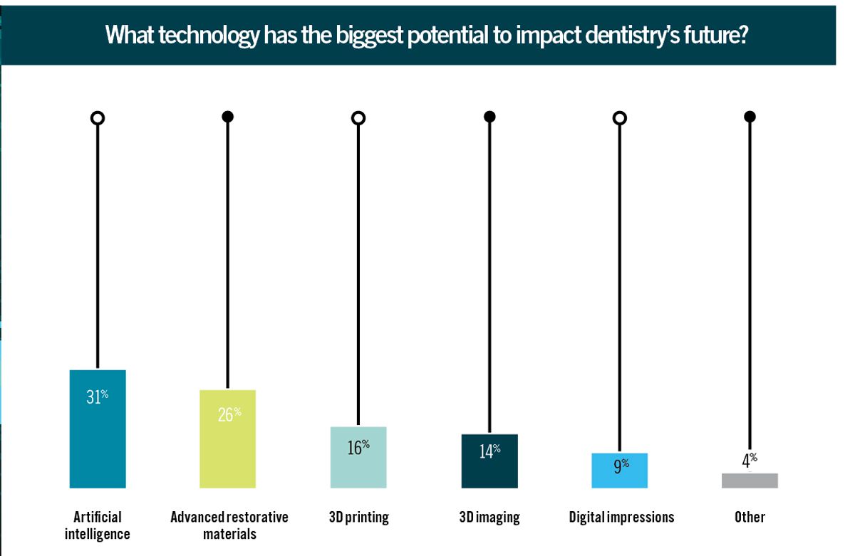 A technology that stands out in each response is artificial intelligence. This quickly growing technology has permeated other markets, so it stands to reason that its steps into dentistry are already taking place, and care may be improving because of it. Respondents also agreed that advanced restorative materials are primed to affect dentistry’s future, especially as the biology and science behind these materials is more widely researched and understood.