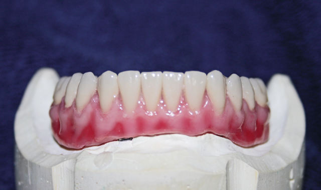 12 For this patient, we elected to further enhance the processed appliance base to recreate root eminences and color variations in the gum tissue using Ceramage Gum Color kit, a line of color composites (uniquely composed of 73-percent zirconia to yield luster and strength) that can be applied to acrylic or resin following simple manufacturer’s instructions. The result is a denture base with a beautiful, natural color translucency. (Figs 16-18)