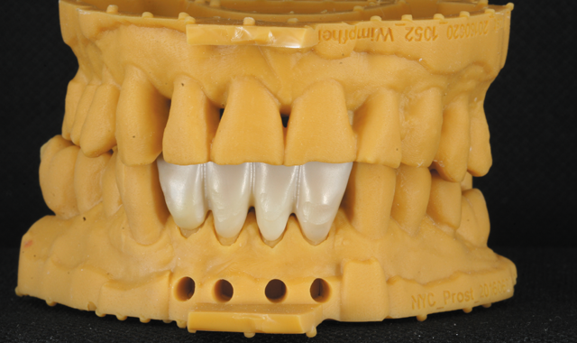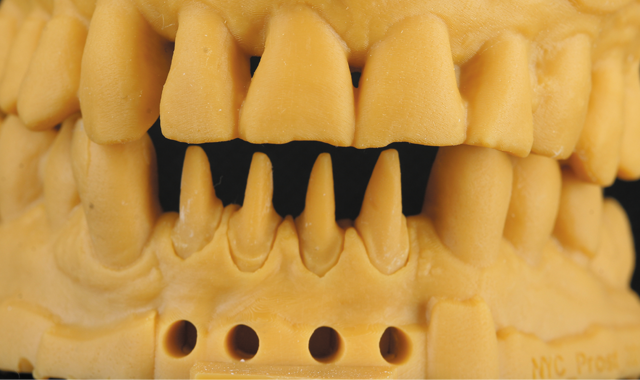 In the past, the splinted crowns required for this case had to be constructed with porcelain-fused-to-metal (PFM).9 Today, the use of zirconia allows for a stronger, more esthetic fixed construction.10 Therefore, after analyzing all of the case information, it was decided with the patient that the final treatment would consist of splinted monolithic zirconia (Zenostar/Wieland, Ivoclar Vivadent) crown restorations.