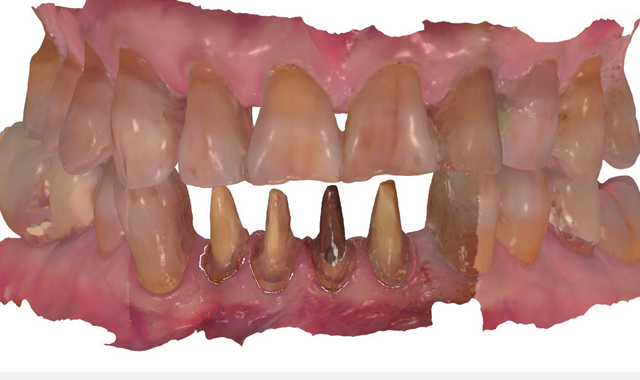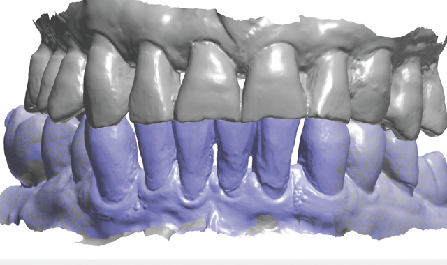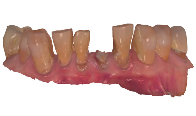 then removed and the preparations cleaned with chlorohexidine 2%, after which they were also scanned (Fig. 8). Prior to a digital workflow, these impression processes would have required the use of trays and elastomeric impression materials, pouring of models and considerable chair time. In this case, the digital scans were used to create digital