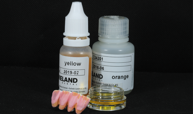 First, the dentin color was applied (Fig. 15), followed by the orange modifier to color the root area of the crowns (Fig. 16).