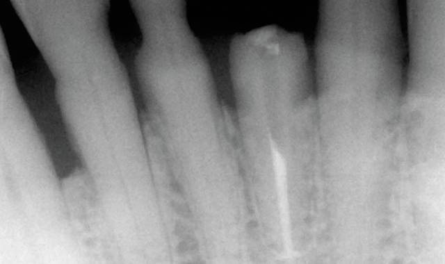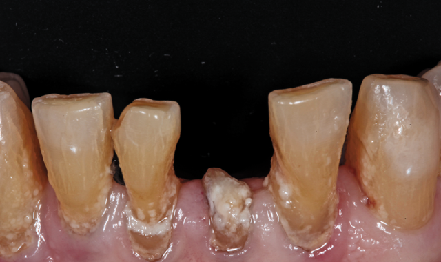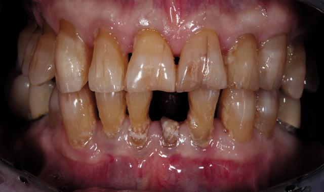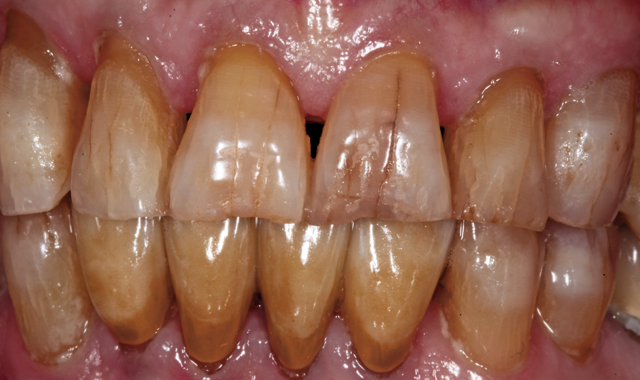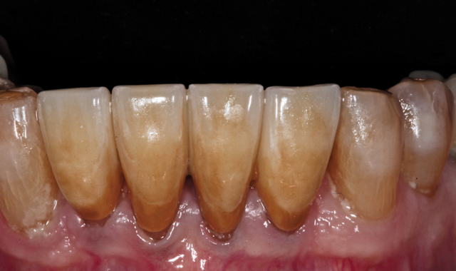 An 88-year-old man presented for restoration of tooth #25, which was fractured and had been endodontically treated (Fig. 1). A thorough intraoral and radiographic examination was performed, which revealed damage to the remaining anterior mandibular teeth incurred over the years as a result of scaling and curettage (Fig. 2). This damage to the