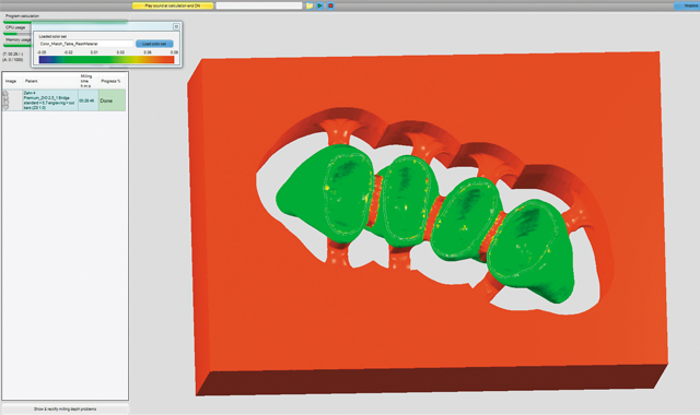 Prior to milling, the software created a simulation of the milled construction. This allowed the user to check for undercuts and preview the tool path (Figs. 11 and 11a). The Zenotec Hybrid Select then completed the milling of the zirconia construction (Fig. 12).