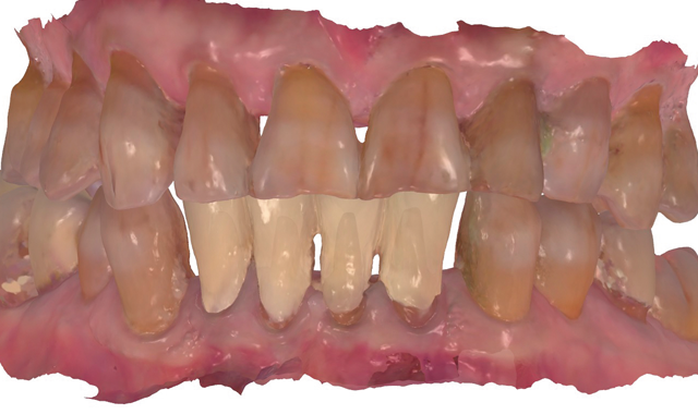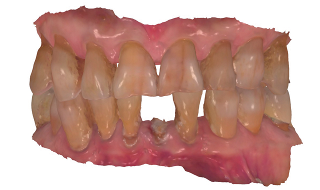 Treatment began by taking an intraoral 3D impression scan (3Shape TRIOS 3) (Fig. 4), after which a digital diagnostic “waxup” was created using Dental Designer (Fig. 5). Using digital intraoral scanning and digital “waxups” eliminated the need for time-consuming conventional impression taking, saving the patient time and eliminating discomfort. Additionally, proper shading, tooth size and contouring could be determined by examining and manipulating the digital impression/model images and