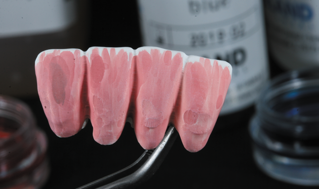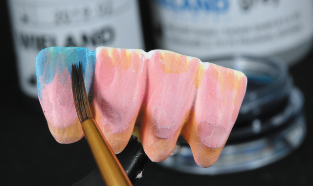 After milling, the frame was removed from the puck and prepared for coloring in the “green stage”, prior to sintering (Fig. 13). The Zenostar Color Zirconia was then used to color the zirconia. Coloring in the pre-sintered green stage allows penetration of the colors, thereby improving the esthetics (Fig. 14).