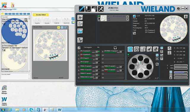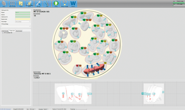 The file was sent to the Zenotec mill, and a Zenostar MT zirconia puck was selected, after which the design file was nested in the puck (Fig. 10). However, at the same time that the restoration CAD .stl file was sent to the laboratory for milling, the file was also used to enable production of a 3D-printed model with removable dies for verifying the proximal and occlusal contacts of the final