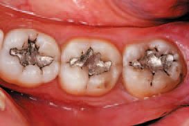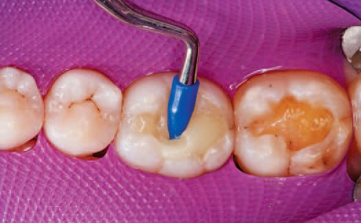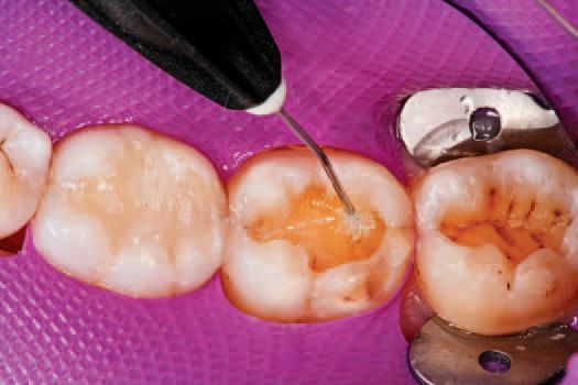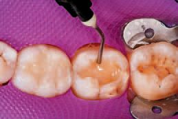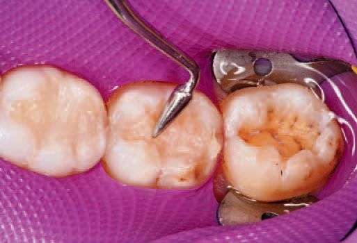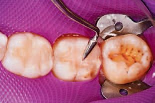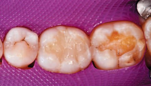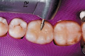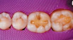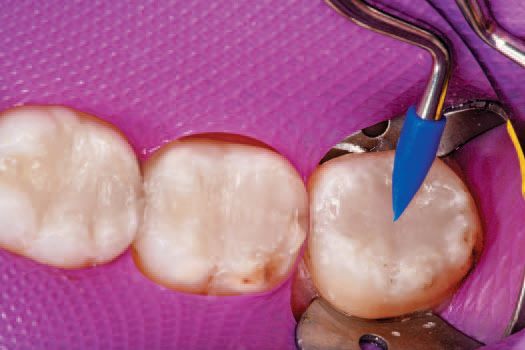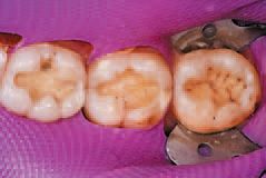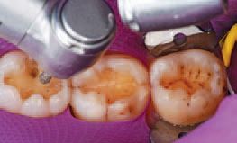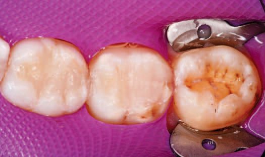 After inspecting the old amalgam restorations (Fig. 2), a rubber dam was then placed (Fig. 3). Next, using Sybron Dental’s Axis course diamond bur, KS3, the amalgam restorations and all damaged tooth structure were removed (Fig. 4).