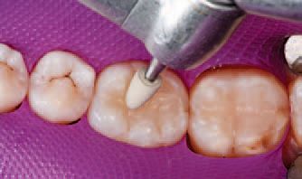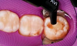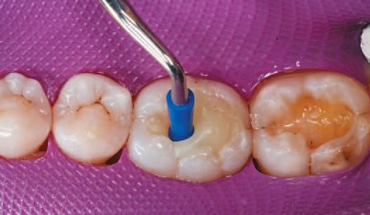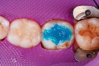 All remaining sharp edges of the preparation were then beveled with Sybron Dental’s Axis fine finishing diamond #846-016, completing the preparations (Fig. 5). Ivoclar Vivadent’s AdheSE® One F self-etch dental adhesive was applied to tooth No. 30 using the VivaPen™ delivery system (Fig. 6), leaving a shiny bonded surface (Fig. 7).