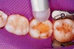 ExciTE® F total-etch dental adhesive was then applied to the preparation and agitated for 10 seconds (Fig. 16). A stream of warm air was expressed onto the adhesive to evaporate the solvent (Fig. 17), and the adhesive was light cured using the Bluephase Style for 10 seconds.