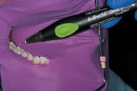 A stream of oil-free, moisture-free air expelled from a warm air tooth dryer from A-dec was then directed over the adhesives to evaporate the solvent (Fig. 8). The adhesive was light cured with Ivoclar Vivadent’s LED curing light, Bluephase Style, for 10 seconds.