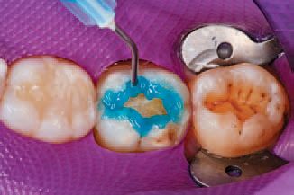 Lastly, preparations began on tooth No. 32 by applying the Total Etch phosphoric acid to the enamel and allowing 15 seconds for penetration, then applying the etchant to the dentin and allowing 10 seconds for penetration. Then, the etchant was completely rinsed off, leaving the area moist. ExciTE F dental adhesive was then applied, and a warm stream of air was directed over the preparation to evaporate the solvent.