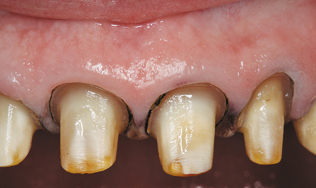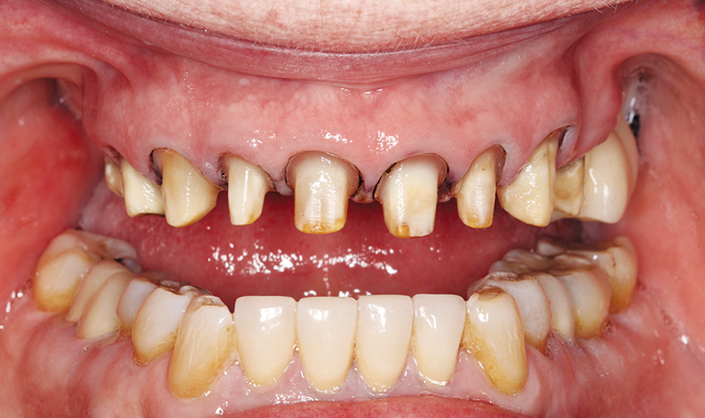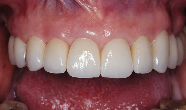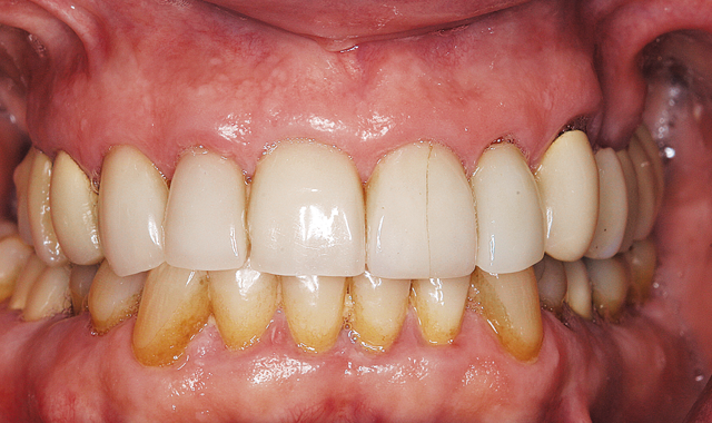 Our patient, a female in her 60s, had undergone a reconstructive dental process 15 years earlier with unfortunate issues involved with the work from the beginning. The porcelain popped off repeatedly, requiring frequent visits to the new dentist and numerous re-cementations.