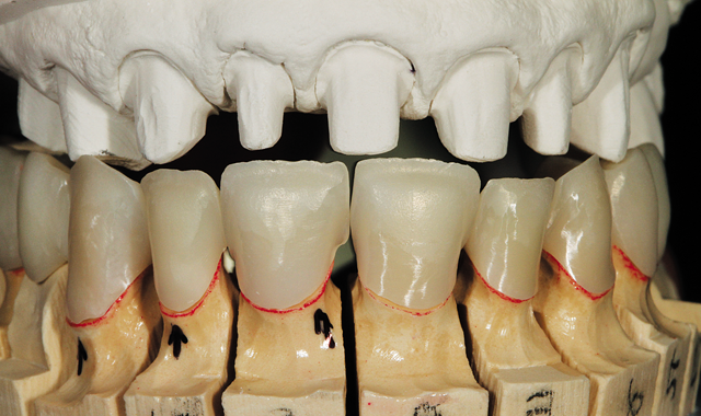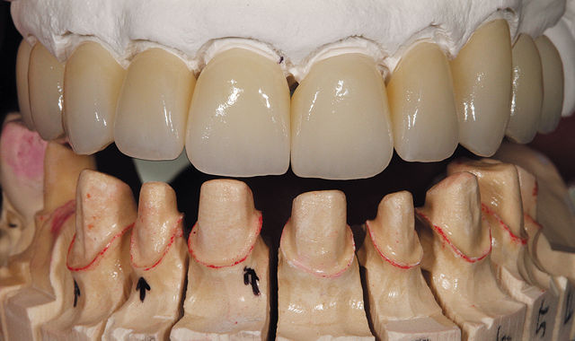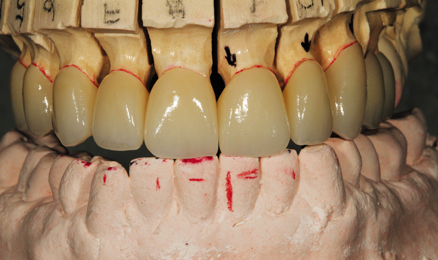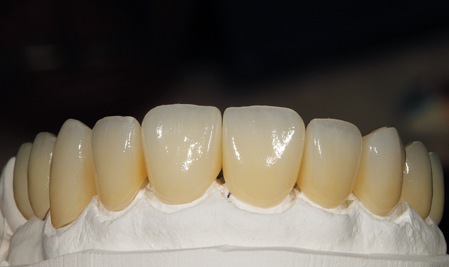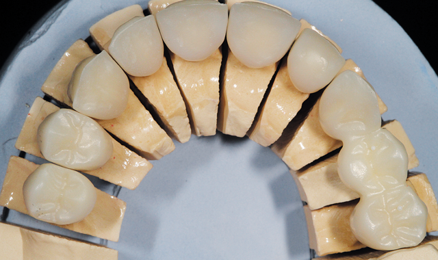 After porcelain application, glazing, polishing and baking, the restorations were placed on the model for an occlusion view