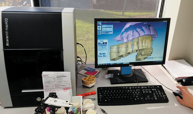 The author and the Digital Design Department were able to utilize the latest technology for scanning and designing our patient’s case with the Amann Girrbach Ceramill Map400 scanner (Fig. 4) after the lab received the case from the dentist. After milling the copings with the Ceramill Motion 2 milling machine, and after sintering for eight hours, this is the copings’ appearance before color application (Fig. 5).
