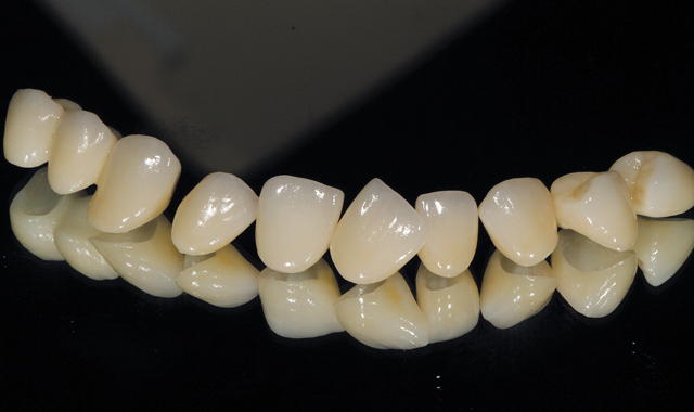 A mirror image of the five single units and two multiple unit bridge restorations-based on color selection between A1 and A2 with translucency (Fig. 11)-follows. Looking at the protrusion view with the mandibular model and the restorations in