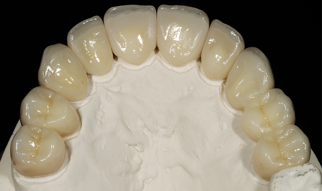 An opposite view from Figure 6 shows the final restorations on the model with the prepped model below for another comparison view (Fig. 9). The final restorations were placed on the solid model, with porcelain from the GC Initial Zirconia system (Fig. 10).