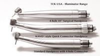 The Illuminator Series incorporates an LED light into the handpiece head, powered by a generator contained within the handle. The pneumatically driven generator powers the LED directly. Air enters the rear of the handpiece through standard four-hole tubing at 32 to 35 psi, spinning the e-generator at 18,000 rpm and generating bountiful energy to power the LED, resulting in a bright white, low heat light. Cool under pressure, the turbine is made in the U.S. with the highest grade ceramic bearing available. The press-button chuck is fabricated from high grade materials that result in strong bur retention and ease of bur entry. The Illuminator LED Series has either a four-hole fixed back end or quick-connect, making it compatible with any dental unit.
