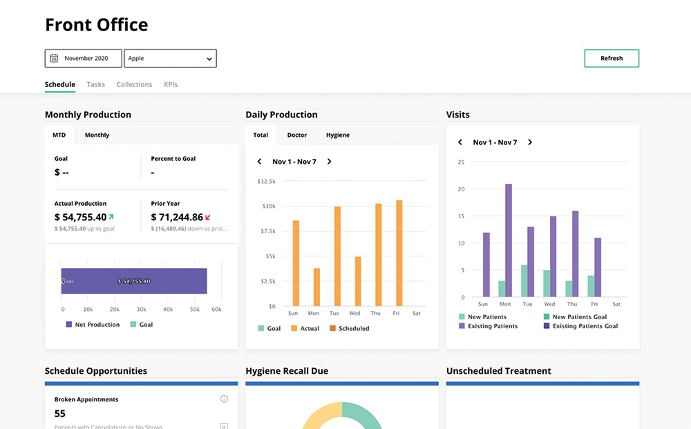 Another module that can help smaller practices is Front Office, which is designed to streamline the office manager’s responsibilities by highlighting important, real-time metrics. This module provides office staff with the ability to switch among 2-, 7- and 30-day views of everything from month-to-date financials broken down by business line, to daily tasks, and even measurements of the guest experience, and staff performance.