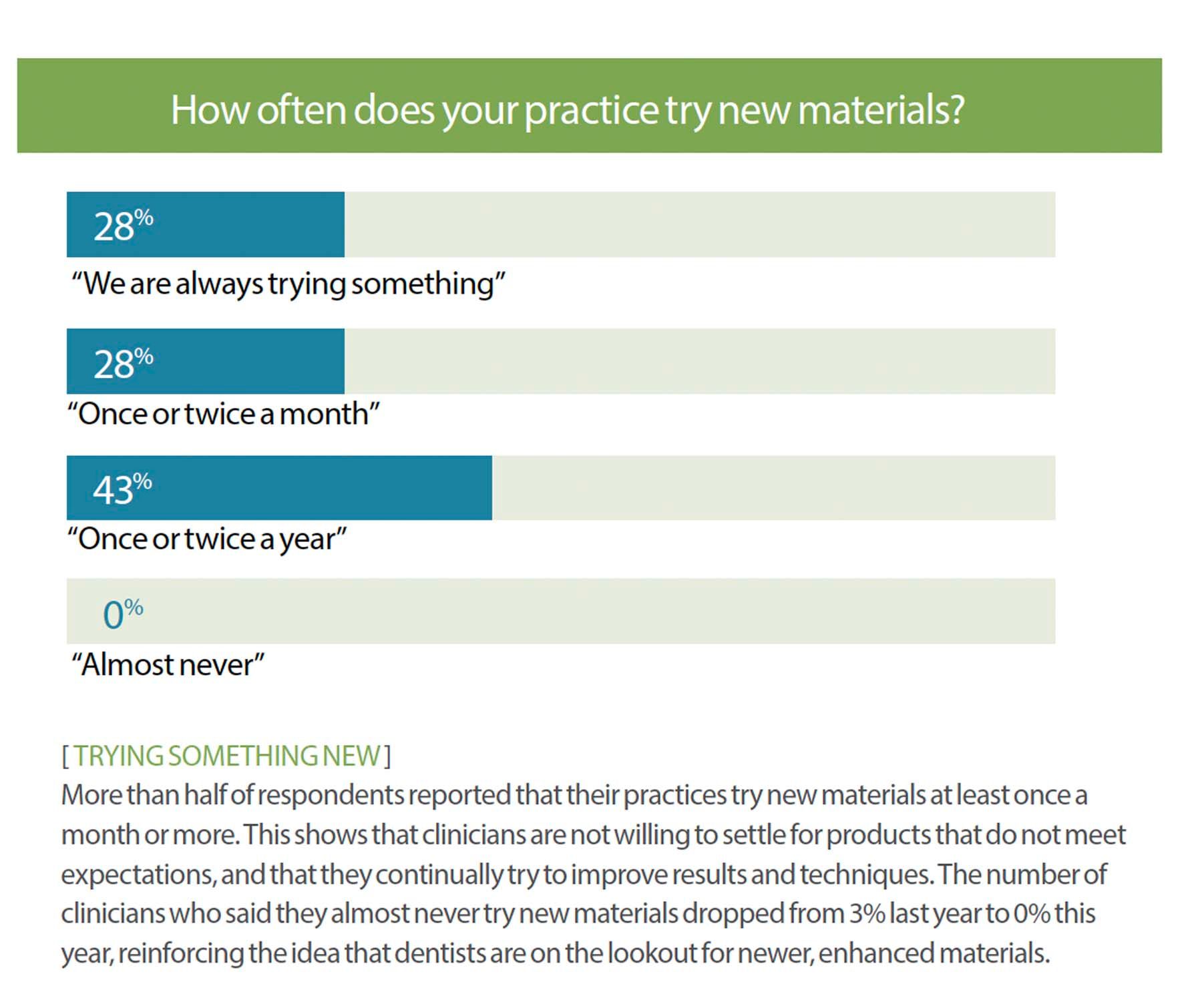 More than half of respondents reported that their practices try new materials at least once a month or more. This shows that clinicians are not willing to settle for products that do not meet expectations and that they continually try to improve results and techniques. The number of clinicians who said they almost never try new materials dropped from 3% last year to 0% this year, reinforcing the idea that dentists are on the lookout for newer, enhanced materials.