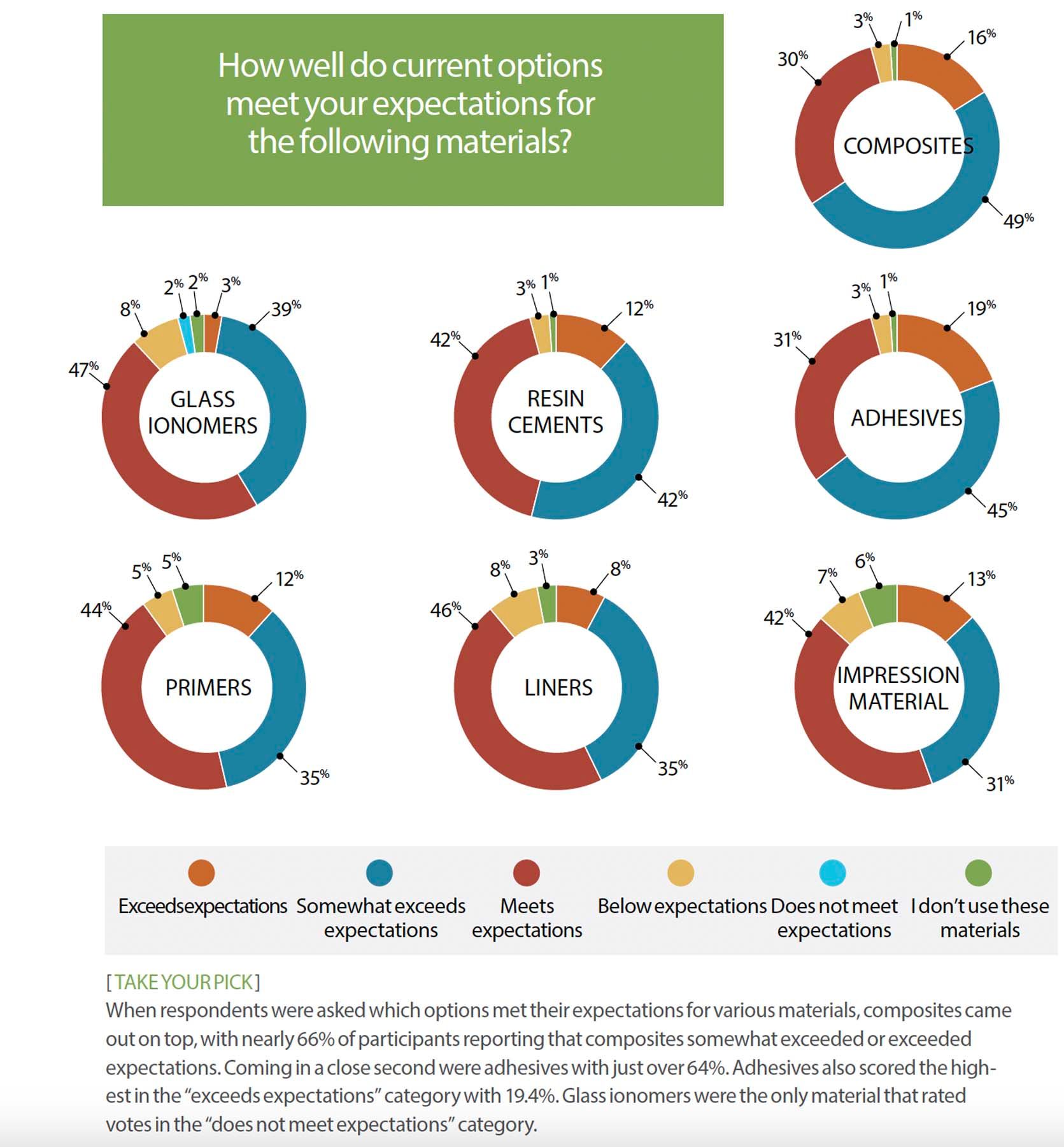 When respondents were asked which options met their expectations for various materials, composites came out on top, with nearly 66% of participants reporting that composites somewhat exceeded or exceeded expectations. Coming in a close second were adhesives with just over 64%. Adhesives also scored the highest in the “exceeds expectations” category with 19.4%. Glass ionomers were the only material that rated votes in the “does not meet expectations” category.