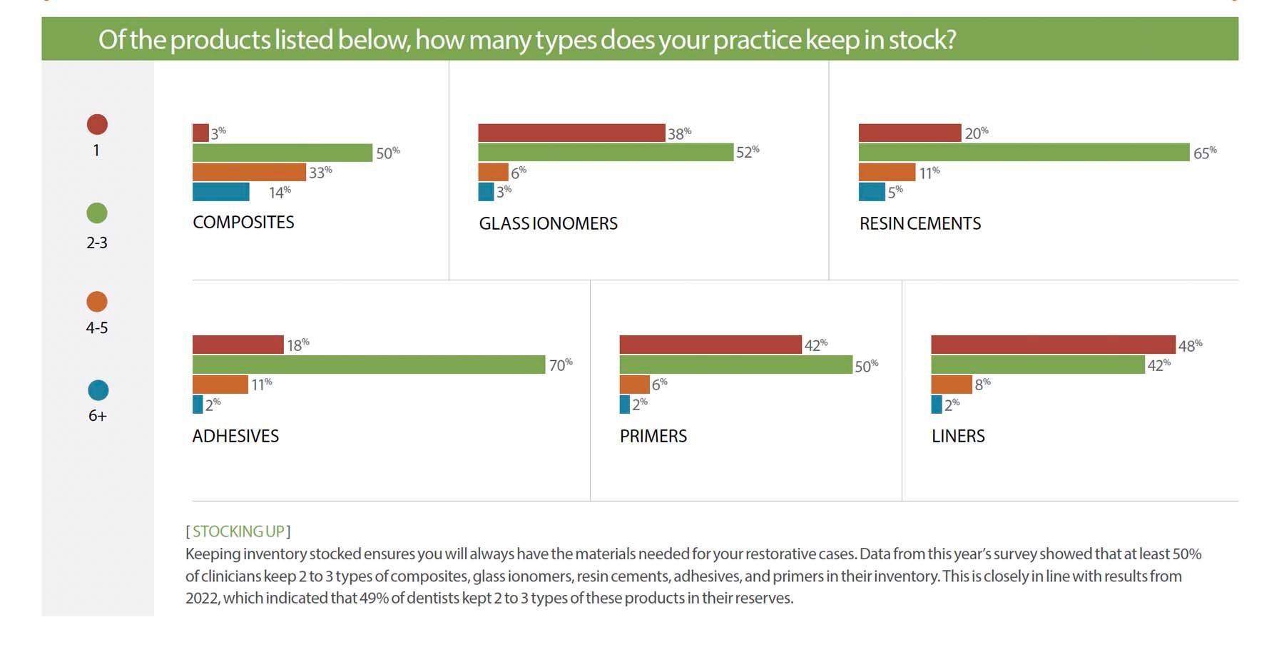 Keeping inventory stocked ensures you will always have the materials needed for your restorative cases. Data from this year’s survey showed that at least 50% of clinicians keep 2 to 3 types of composites, glass ionomers, resin cements, adhesives, and primers in their inventory. This is closely in line with results from 2022, which indicated that 49% of dentists kept 2 to 3 types of these products in their reserves.