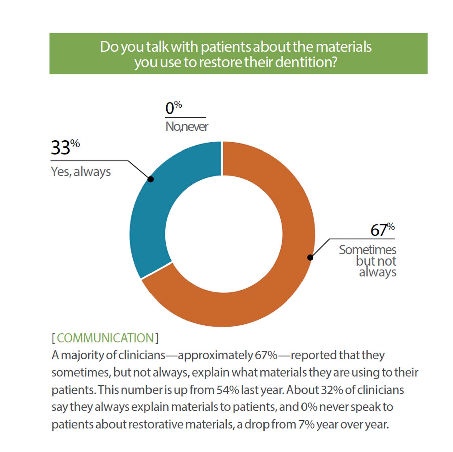 A majority of clinicians—approximately 67%—reported that they sometimes, but not always, explain what materials they are using to their patients. This number is up from 54% last year. About 32% of clinicians say they always explain materials to patients, and 0% never speak to patients about restorative materials, a drop from 7% year over year.