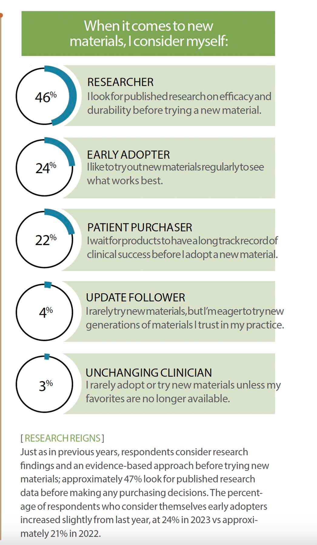 Just as in previous years, respondents consider research findings and an evidence-based approach before trying new materials; approximately 47% look for published research data before making any purchasing decisions. The percentage of respondents who consider themselves early adopters increased slightly from last year, at 24% in 2023 vs approximately 21% in 2022.
