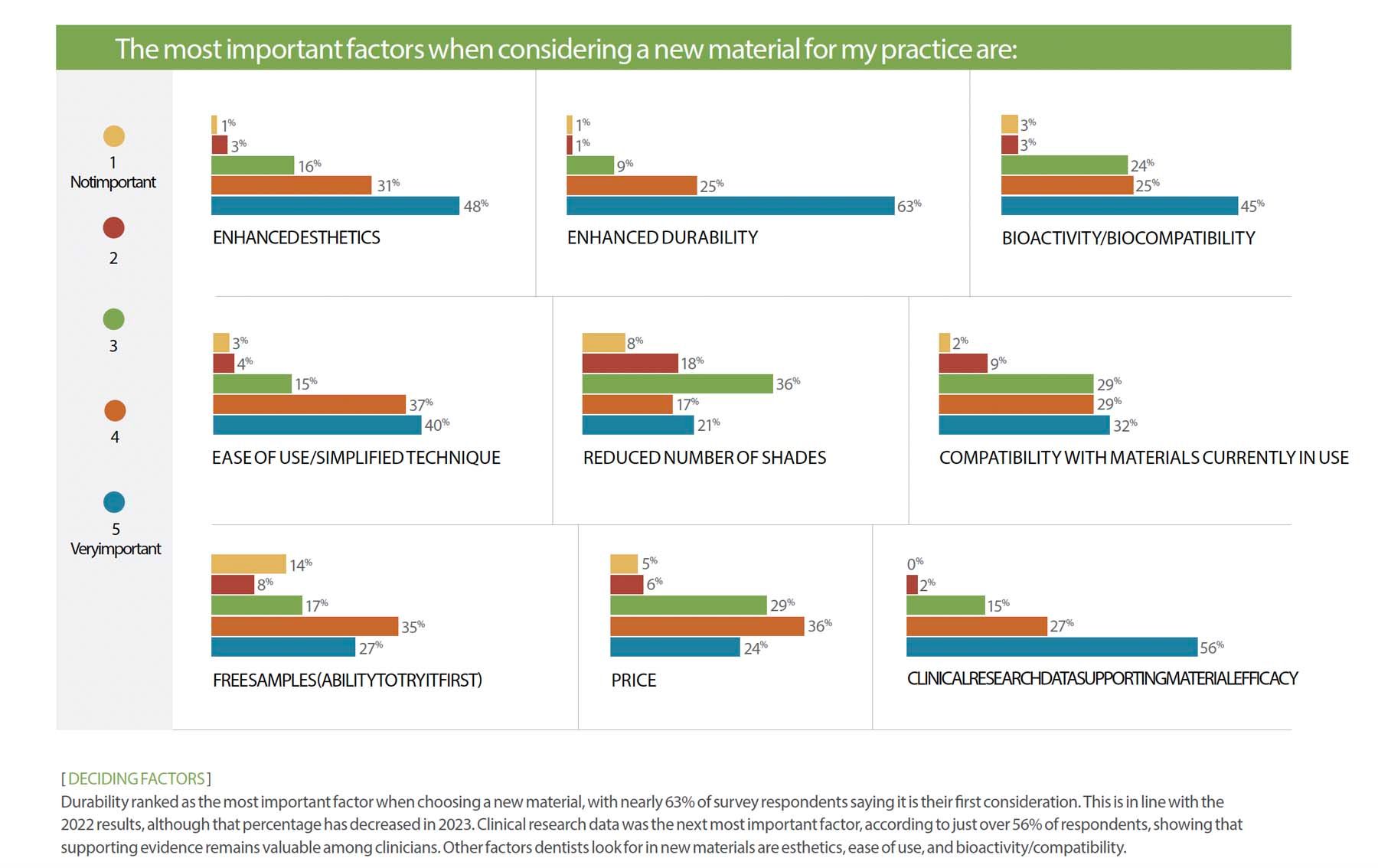 Durability ranked as the most important factor when choosing a new material, with nearly 63% of survey respondents saying it is their first consideration. This is in line with the 2022 results, although that percentage has decreased in 2023. Clinical research data was the next most important factor, according to just over 56% of respondents, showing that supporting evidence remains valuable among clinicians. Other factors dentists look for in new materials are esthetics, ease of use, and bioactivity/compatibility.
