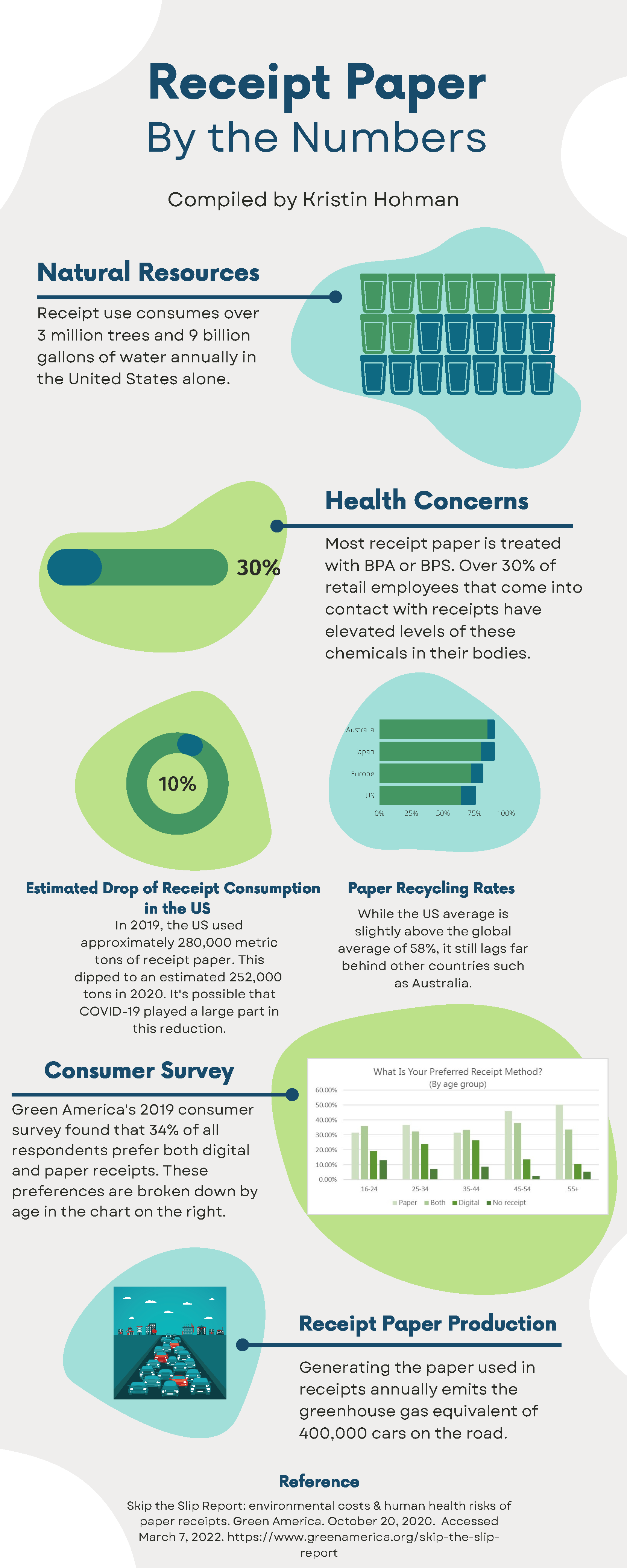 Environmentally speaking, paper receipts take a real toll on the environment. Green America’s Skip the Slip Report cites a study from Grand View Research estimating that the US consumed 280,000 metric tons of point-of-sale receipts in 2019, which required the wood of 3,630,000 trees.1 Annual greenhouse gas emissions produced from manufacturing thermal paper are the equivalent of emissions from over 400,000 cars.1