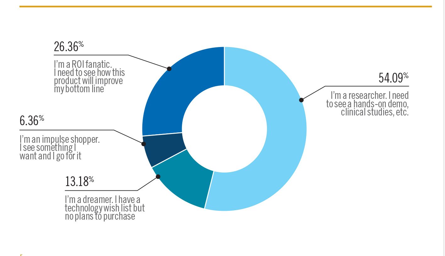 The overall message from the survey is dental professionals are excited by the technologies making their way to their practices. However, the hype around new things fades quickly as dental professionals say they are more likely to invest in new technologies when there is a solid track record of research and clinical success.