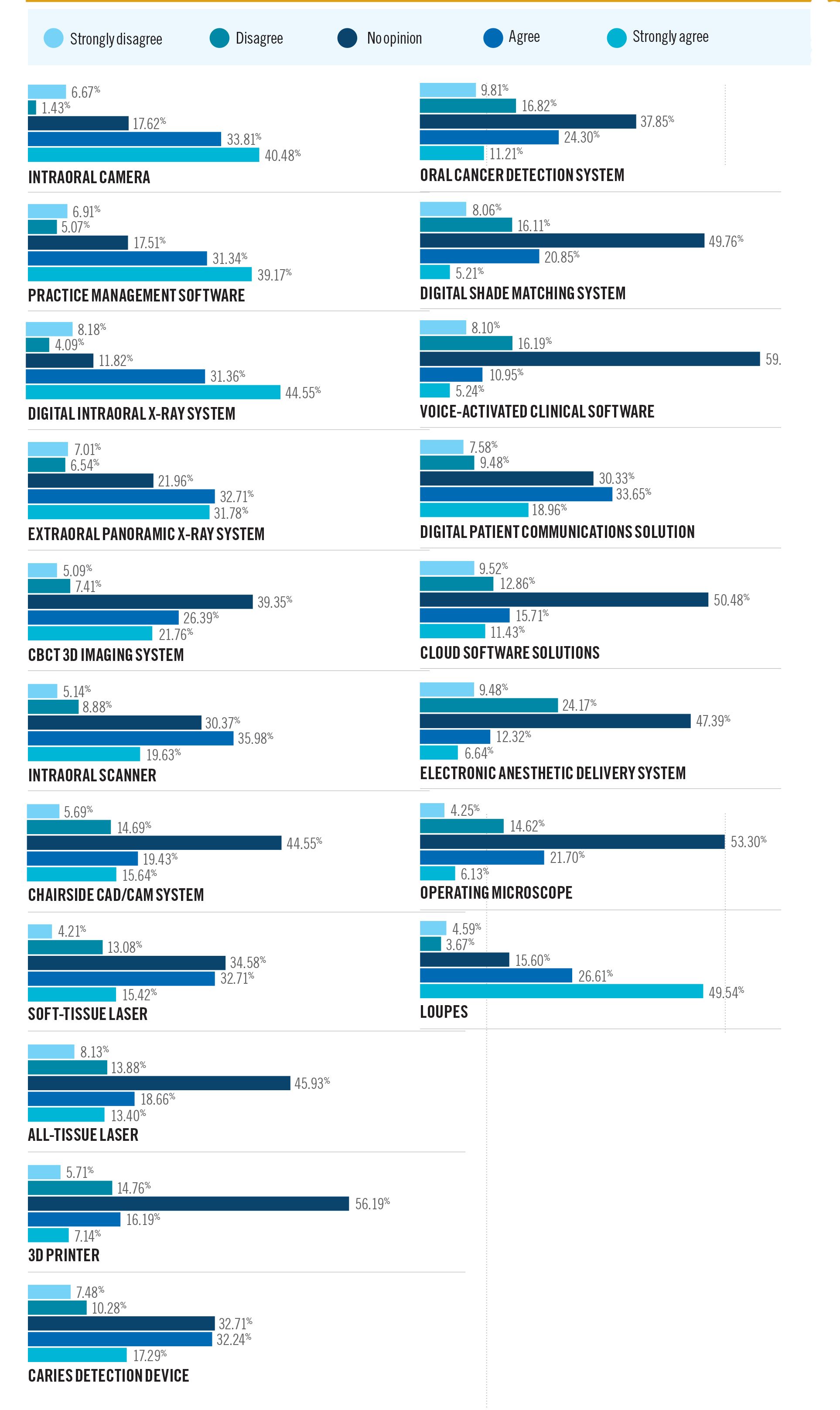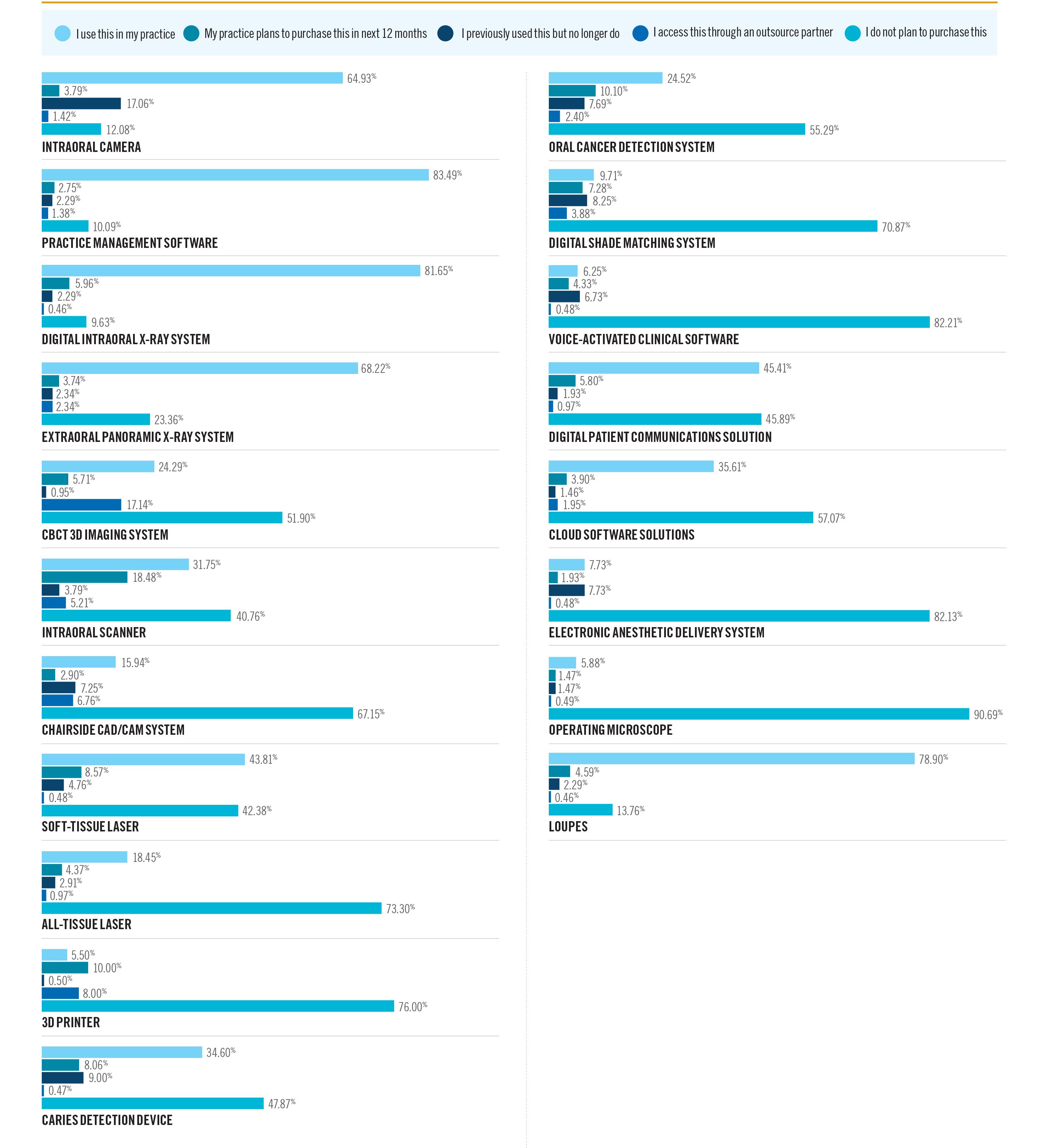 On the other hand, not every technology seems to be in demand right now. More than two-thirds of clinicians said they do not plan to invest in chairside CAD/CAM, all-tissue lasers, 3D printers, digital shade matching technology, voice-activated software, electronic anesthesia delivery systems, or operating microscopes.
