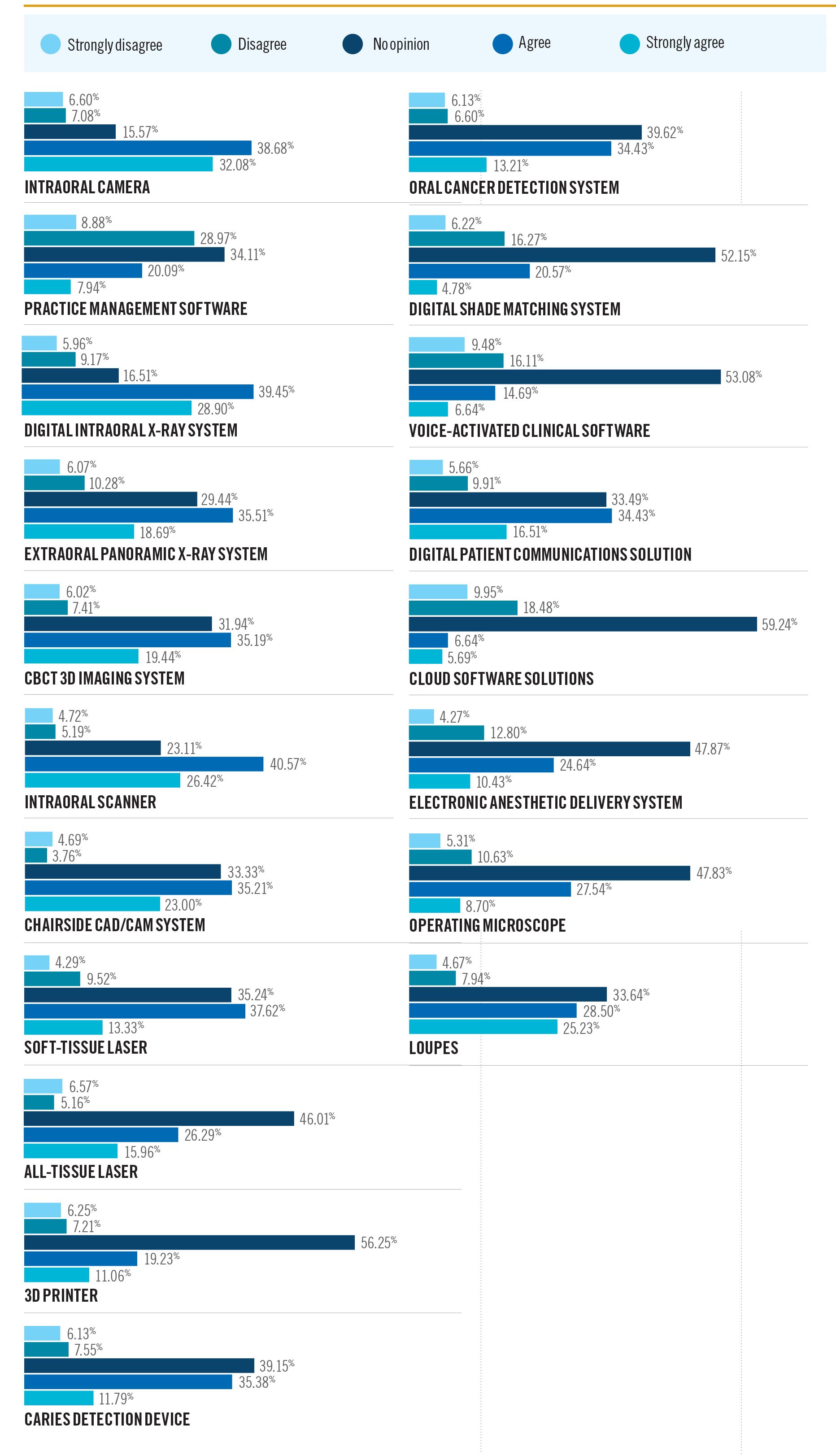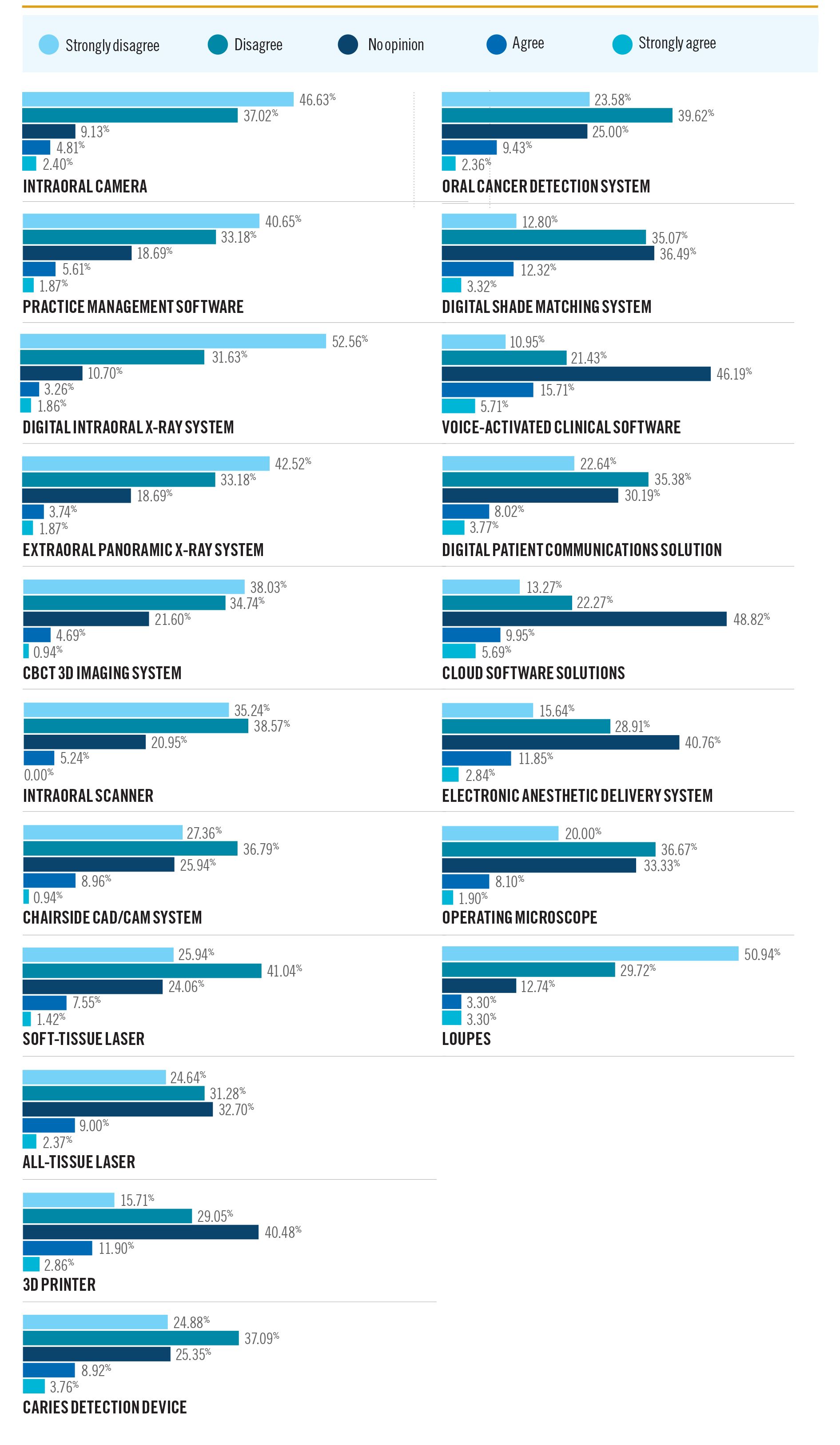 While the clinical efficacy and benefits of any new technology are paramount, dental practices are businesses, and technology investments need to be financially beneficial as well. When asked about the ROI potential of different dental products, clinicians showed a belief in the potential of digital imaging technologies to benefit a practices’ bottom line. Intraoral cameras and digital X-ray systems were both strongly touted by more than two-thirds of respondents. The only other technology to score that high when it comes to ROI was dental loupes. Clinicians showed doubt about the ROI potential of other product types, with electronic anesthesia delivery leading the way, and cloud software, voice-activated software, digital shade matching, oral cancer detection, 3D printers, all-tissue lasers, and chairside CAD/CAM all earning the skepticism of more than a fifth of clinicians.