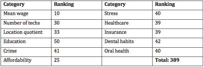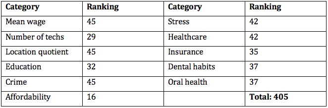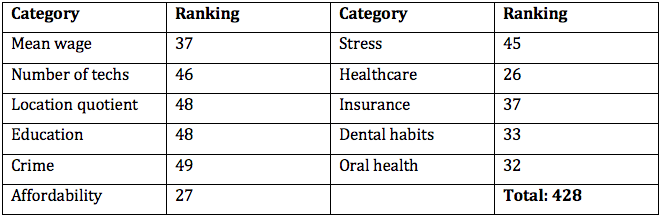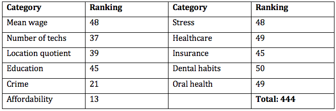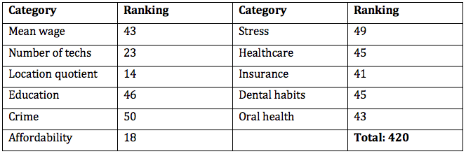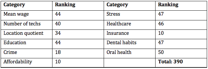 We compiled data from personal finance website WalletHub (giving us dental health rankings); US News and World Report (who contracted researchers McKinsey & Company to evaluate the states for such metrics as health care, finance, and crime rates); and the government’s Occupational Employment and Statistics program (to find out employment data specific to dental lab techs).