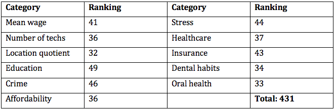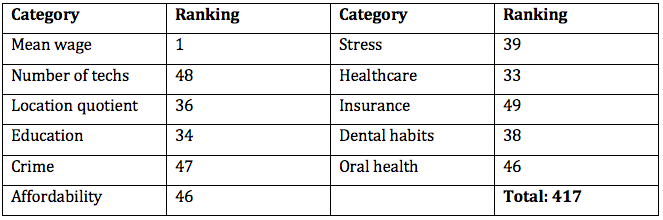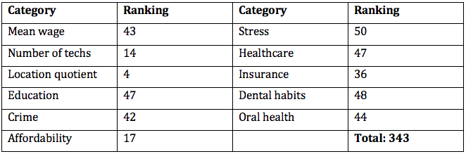 The good news for the Mountain State is that the cost-of-living is in the top 10. Plus, residents have a reasonably high rate of insurance coverage. However, that ranking is little confusing, because West Virginians rank last in terms of oral health and their dental habits are the fourth worst in the country. Lab technicians seem to be in demand, because the state has location quotient putting it in 34th place. The state’s relatively low number of technicians (there are 140) is influenced by a lot of these numbers, not to mention it’s relatively low average wage ($35,070).