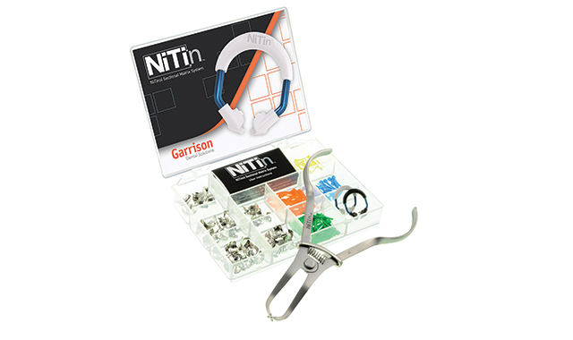 Featuring rings fabricated with drawn-wire Nitinol for reportedly unmatched spring qualities, the NiTin Sectional Matrix System is well suited for Class II posterior composite restorations. The Nitinol material is said to offer like-new separating forces, even after hundreds of uses. The rings feature backers and tips fabricated from PEEK®, a highly durable plastic. The matrix system also features bands with pronounced curvature for easier and more predictable tooth shape replication. The kit includes color-coded wedges as well as forceps for ring placement.