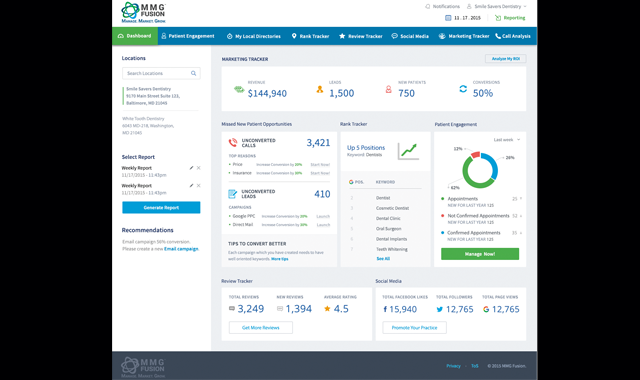 With MMG Fusion you can manage, market and grow your practice thanks to a single sign-in to one powerful dashboard. The practice management software’s features include sections and tools for local SEO optimization, reviews and ratings, negative review management, social media, appointment reminders and online scheduling, email marketing, call recording and call analysis, and an ROI tracker so you know what marketing spends are working.