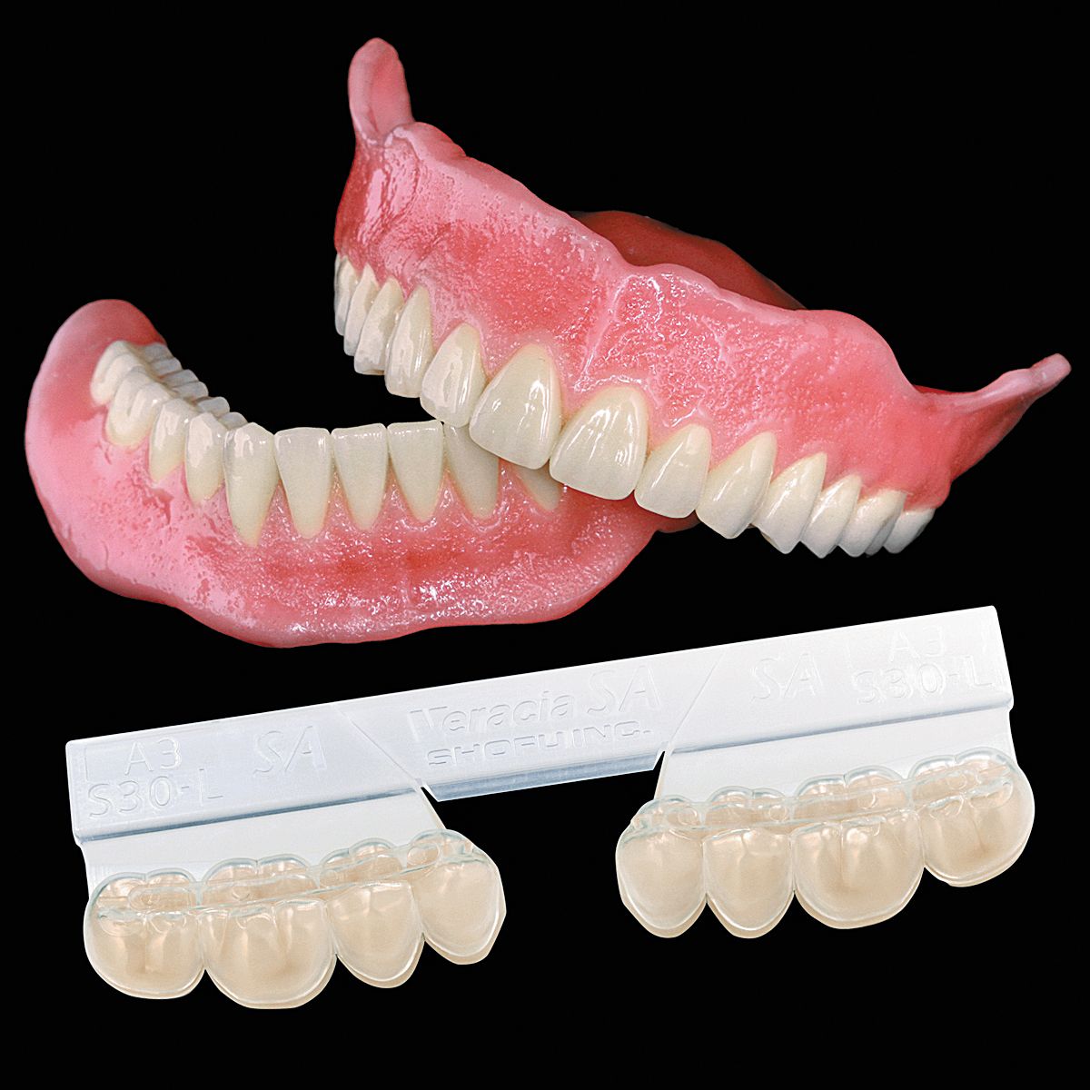 The semi-anatomical Veracia SA denture teeth line takes into account the wear of the remaining natural teeth to provide a symbiosis of natural esthetics and function. The functional characteristics of the teeth are adopted, precisely predetermined and marked with abrasion zones. The result is said to be measurably enhanced chewing performance and pleasant wearing comfort with the stabilized denture, while subjecting the jaw to less stress. Balanced, lingualized, tooth-to-tooth or tooth-to-two-teeth occlusion can be achieved.