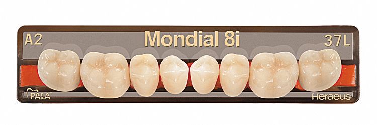 Designed to meet the requirements of implant and geriatric prosthetics and for the treatment of temporomandibular joint disorder (TMJ), the Mondial 8i-5º posterior tooth line features wider necks, increased volume and naturally reduced cusps to provide esthetic concealment of supporting structures. The flat occlusal morphology ensures precise centrics with maximum degrees of freedom in the paths of movement. When used for implant treatments, the flattened multipoint contact area minimizes the initial abrasion.