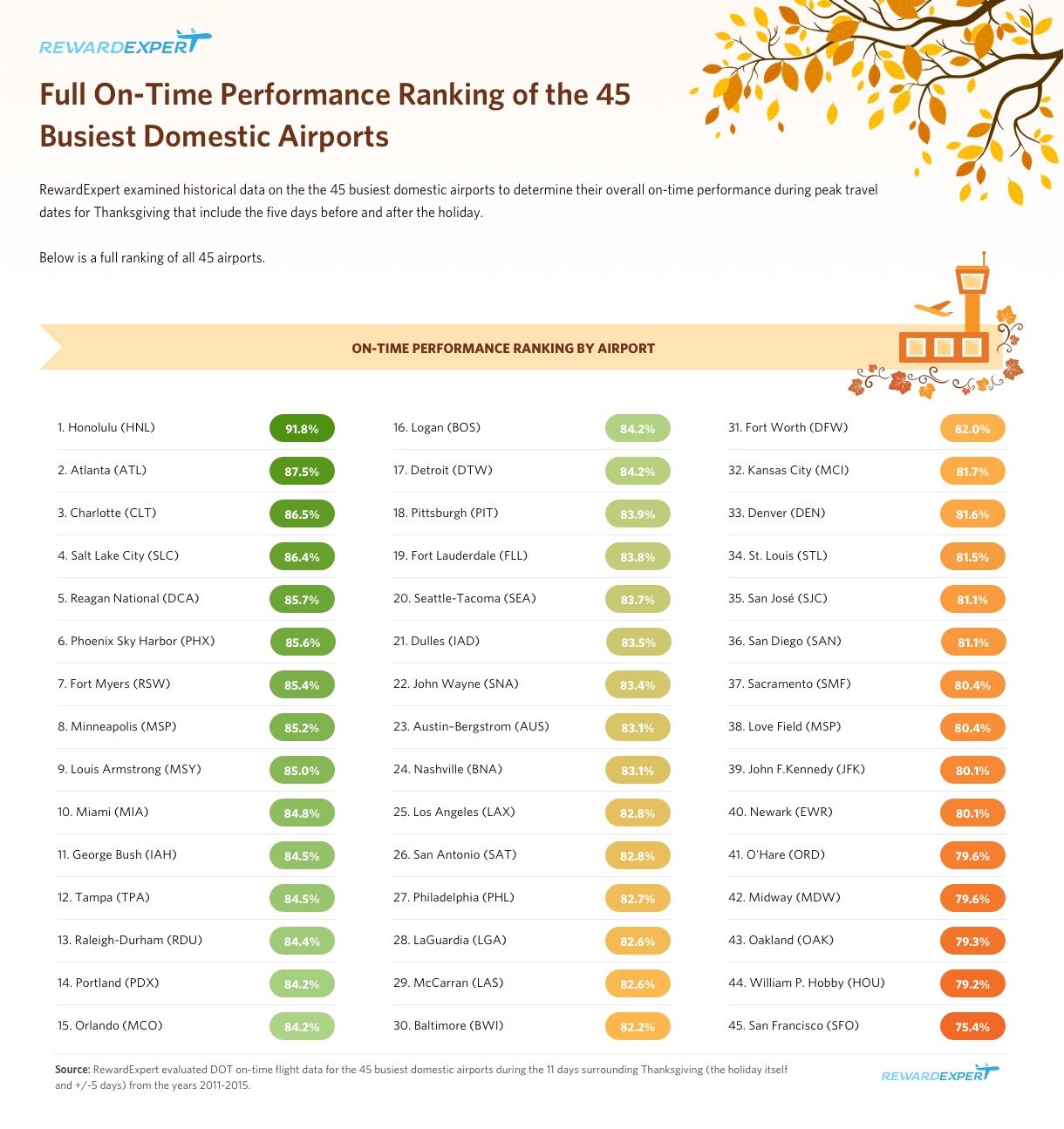 Although being with friends and relatives for Thanksgiving is fun, getting to their houses can be a nightmare of crowded airports and delayed aircraft. To help those traveling by plane avoid a turkey of a flight this Thanksgiving, RewardExpert analyzed the performance of the top 10 domestic airlines at the 45 busiest US airports during the holiday as well as the performance for 5 days before and after Thanksgiving Day.