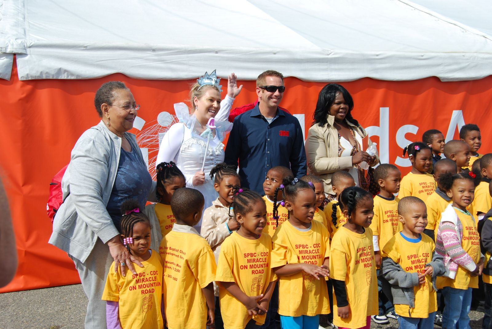 Greg Biffle and the Toothfairy pose with kids who came to participate in the screening.
