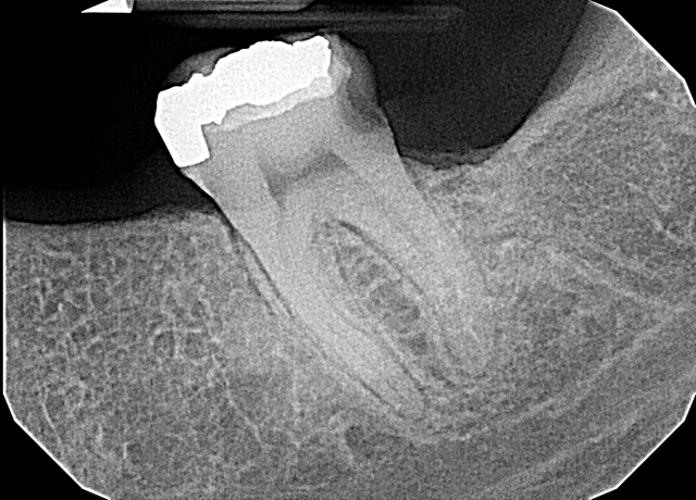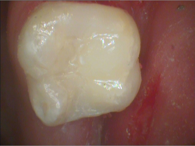 The patient is 26-year-old female with several missing teeth and gross decay of several others. She has neglected her dental care due to limited access and financial duress. The lower right second molar had previously been restored with amalgam. The amalgam had partially fractured out and there was a deep carious lesion with close proximity to the pulp (Fig. 1). The tooth was asymptomatic. The pulp tested vital with traditional pulp testing. Because of the deep decay and proximity to the pulp, I previously would have considered endodontically treating this tooth and then restoring with a passive post and core followed with a full coverage crown.